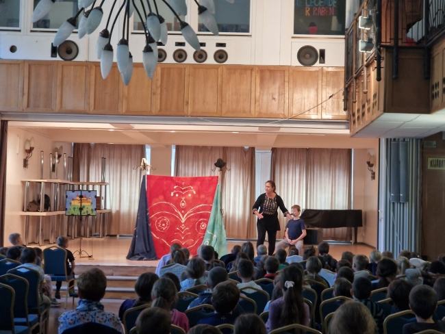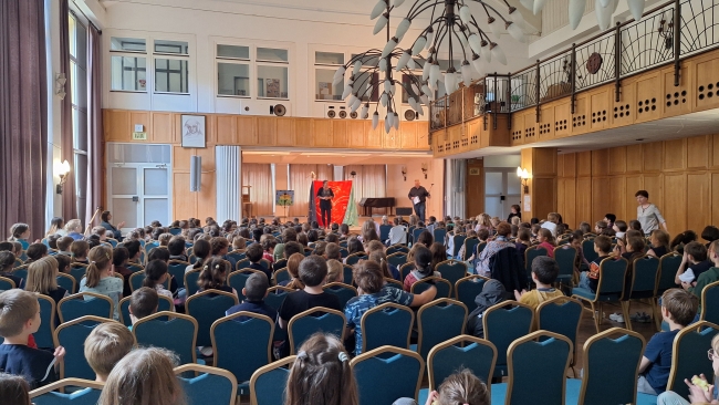 A gyerekek néha csillogó szemmel, néha nevetve figyelték a történeteket és szinte észrevétlenül merültek el a mese világában. A teljes előadás alatt közösen is eljátszhattak egy-egy részletet, így nemcsak nézői, hanem aktív résztvevői is lehettek a mesének.